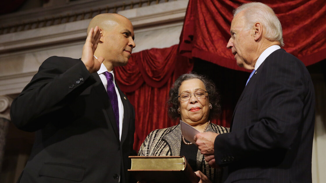 Vice President Joe Biden swears in Sen. Cory Booker (D-NJ) as his mother, Carolyn, holds a Bible on Thursday.